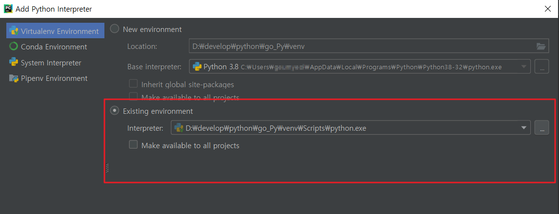 가장 흔한 개발 툴로 PyCharm을 사용하고 있는데, 이 툴에서 Interpreter 경로를 상속받는 기본 설정으로 인해