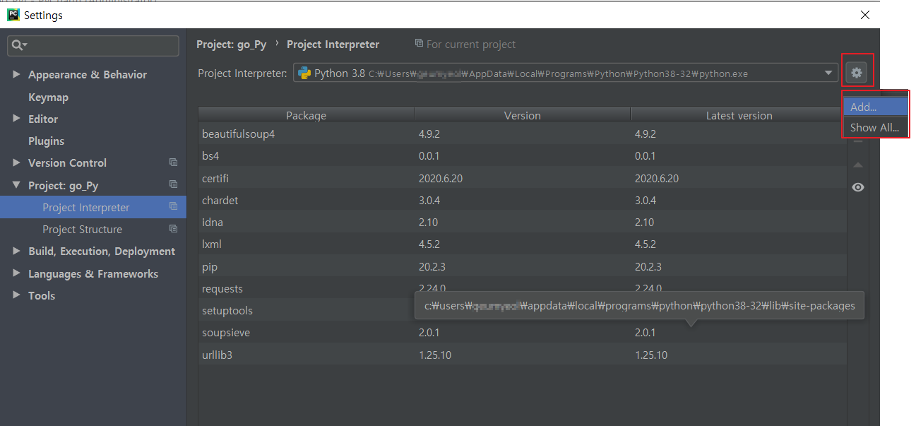 Python 을 몇 번이나 다시 설치하고, CMD 창에서 pip를 통해서 라이브러리를 설치해도 프로젝트에는 반영이 되지 않았다. 이에 전체 프로젝트 환경에 대한 정보를 수정하기 위해 File > Settings에서 Project Interpreter를 수정하였다.