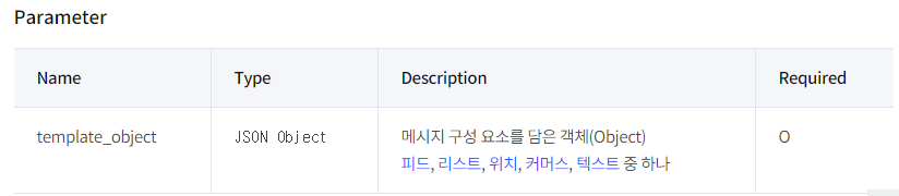 카카오의 POST 메시지는 template_object 파라미터로 구성한 메시지를 전달해야 하며, 타입은 JSON 으로 보내야 한다.
