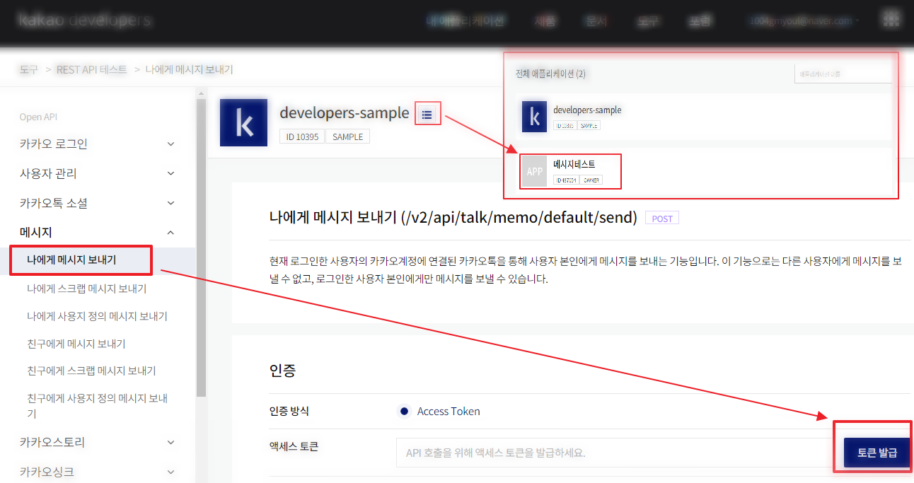 이 경로를 찾는데 많은 시간을 보냈다. 다른 블로그등을 보면 [내 애플리케이션] 등을 통해 토큰 발급을 받으라고 했지만, 어디에서도 토큰 발급 경로를 찾기 어려웠고, 위 메뉴를 누르다 경로를 확인하게 되었다.