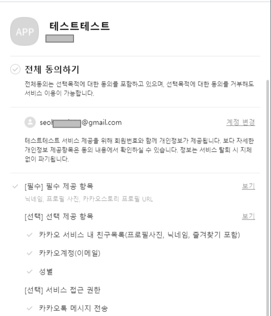 4. 팀원 동의항목 : 카카오 서비스 내 친구목록(프로필 사진, 닉네임, 즐겨찾기 포함) -> 이용 중 동의 설정