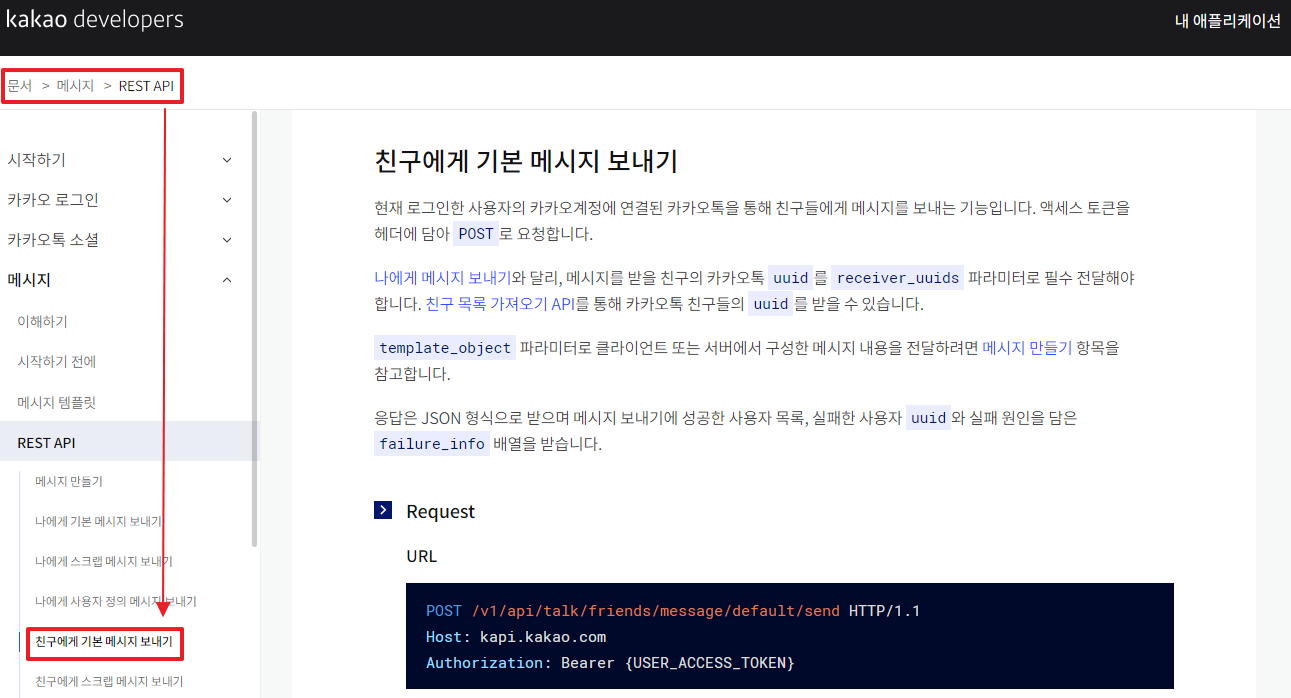 1. kakao developers 사이트 참조 (https://developers.kakao.com/docs/latest/ko/message/rest-api#send-friend)