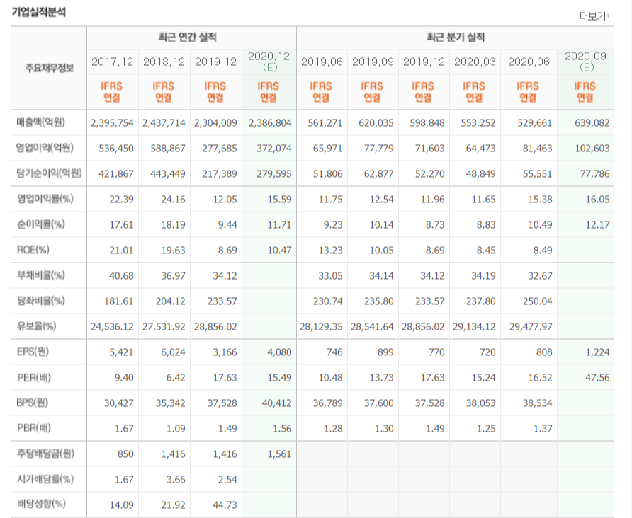 최근 3년간 연간실적과 최근 1년간의 분기 실적을 자세하게 보여주며, 실적의 추세를 쉽게 볼 수 있다.