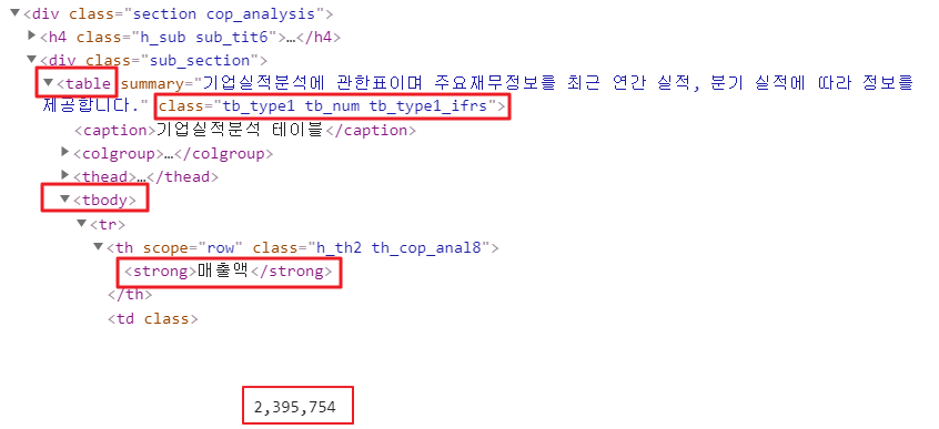 여기에서 우리가 결국 가져오고 싶은 값은 매출액에 해당하는 ..tbody > tr > td 에 있는 각각의 값이다.