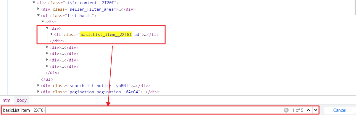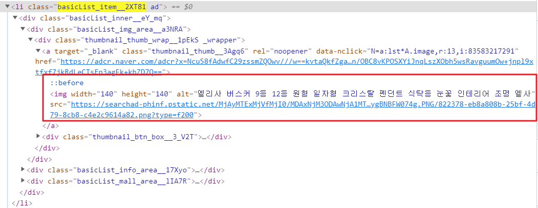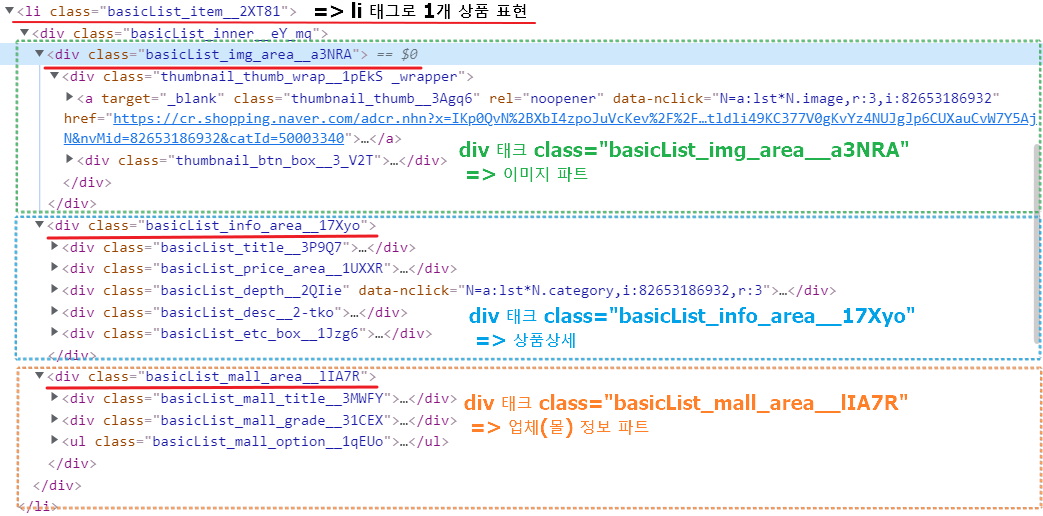 개발자 도구를 통해서 각각의 상품 정보를 li 태그(class:basicList_item__2XT81)나 div 태그(class:basicList_inner__eY_mq)를 통해서 접근이 가능하며, 각각의 상품에서 div 태그의 이미지/상품/업체 정보에 매핑되는 class 를 지정하면 데이터에 접근이 가능할 것이라는 방향성으로 추출을 진행하고자 하였다.