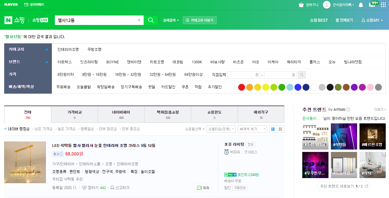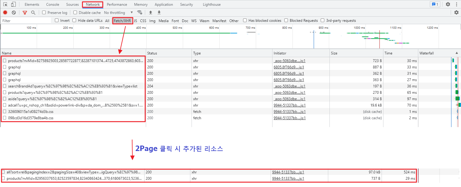 다시 처음으로 돌아가서 네이버쇼핑에서 동일 키워드 "엘사 12등"을 검색하면 아래와 같은 화면을 볼 수 있고, 이때 개발자 도구(F12) 를 통해 네트워크 정보를 확인할 수 있다.