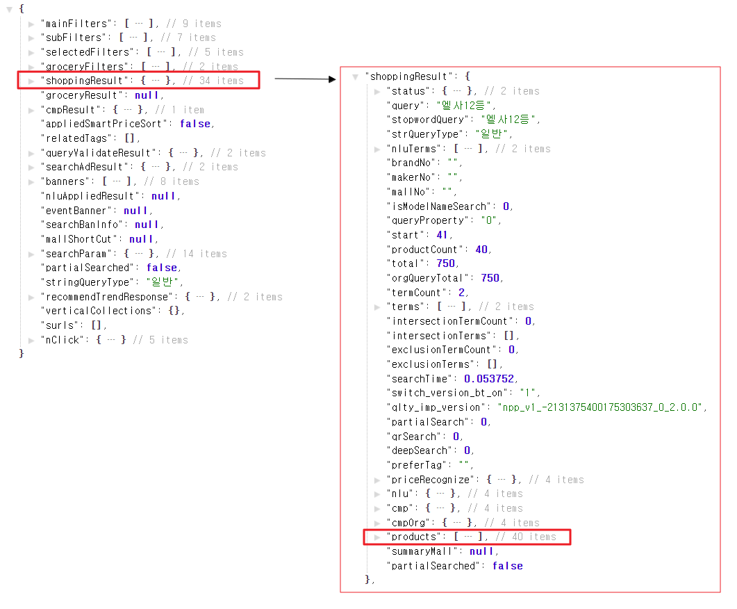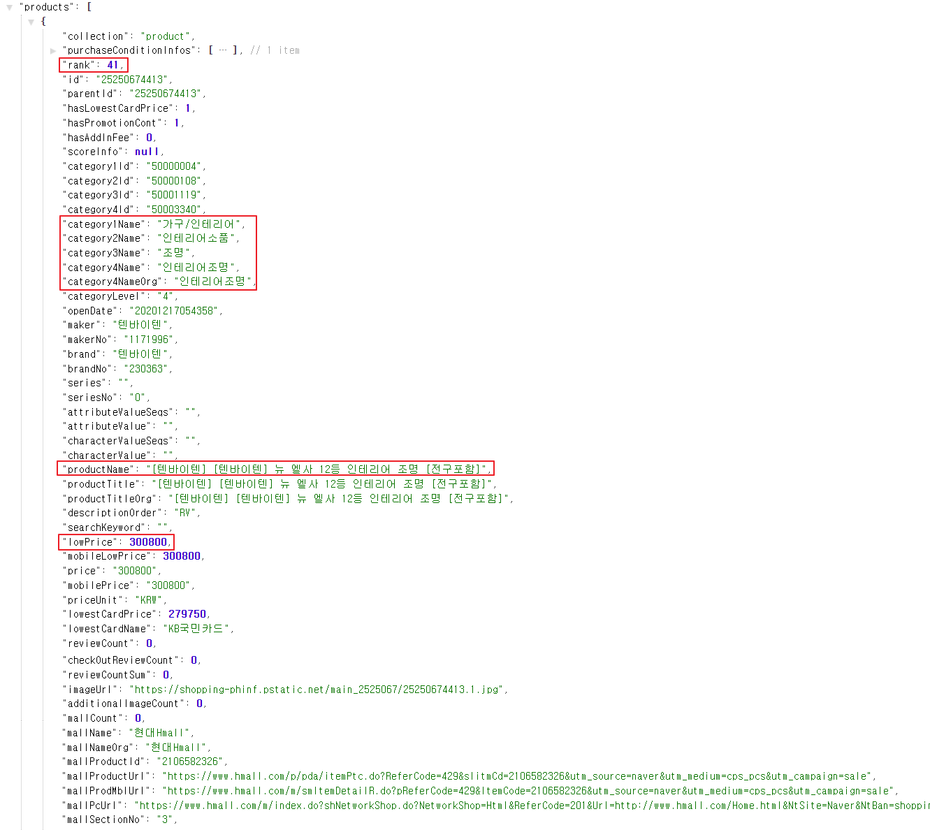 Json 내 구성 정보 : ShoppingResult > products 상품 세부 정보 추출 가능