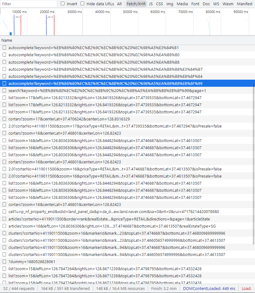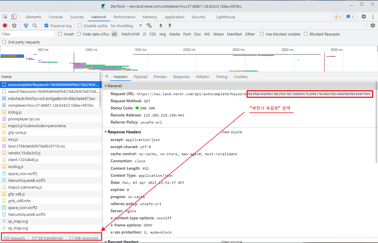 개발자 도구를 켜 놓고 방금 했던 동일한 행위를 해보면 인터넷 상에서 내가 원하는 데이터가 어디에 있는지 확인해볼 수 있다. 아무런 다른 액션을 하지 않고 단순히 "부천시 옥길동" 키워드만을 검색했는데 아래와 같이 105번의 requests 가 있었다.