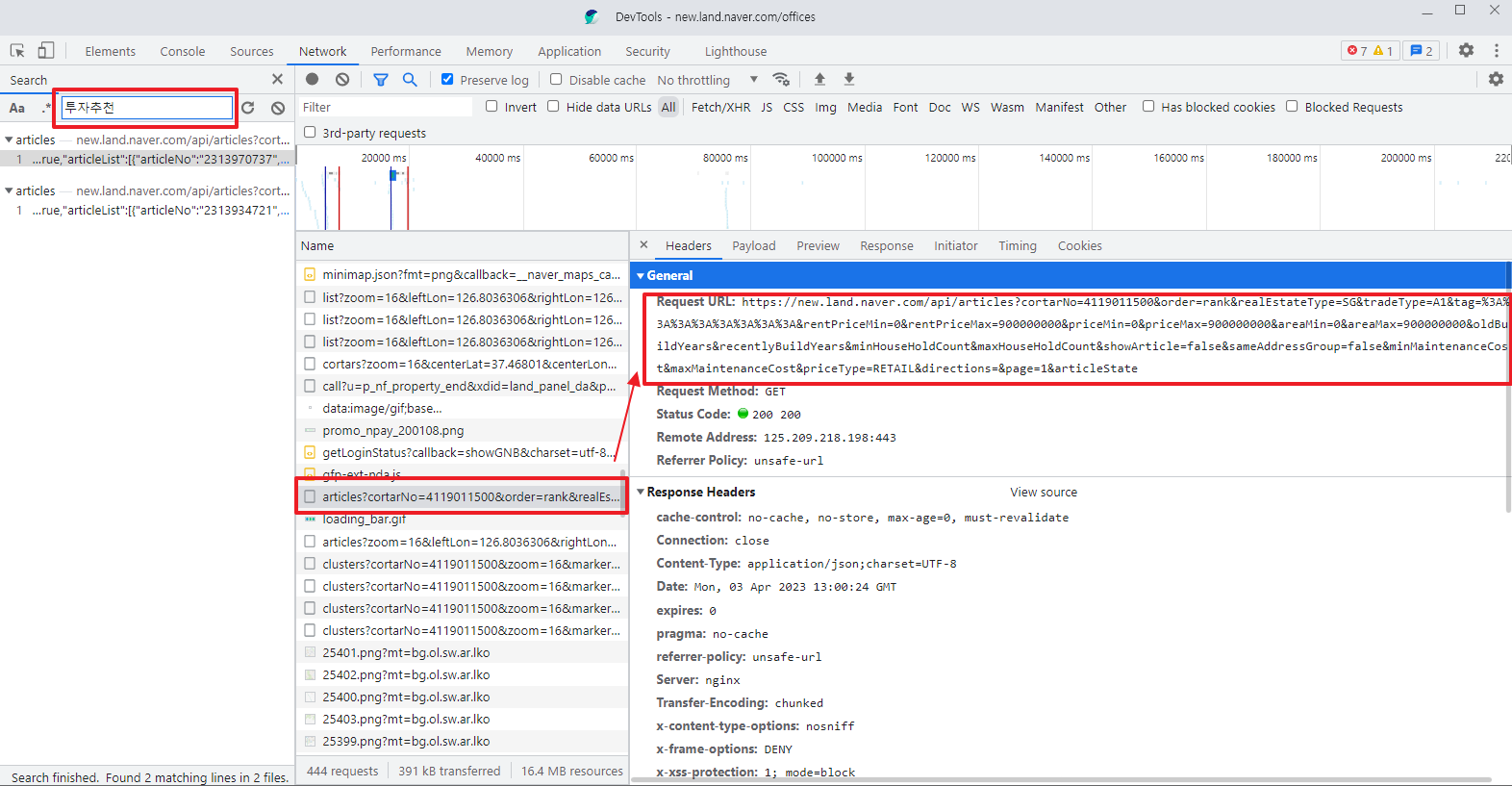이 단계에서 우린 개발자도구의 검색 기능을 활용하여, [그림1]에서 잠시 보였던 상가 매물에 있는 키워드를 통해 검색을 해보자. 필자는 첫번째 매물에 있는 키워드 "투자추천"으로 검색을 해 보았다.