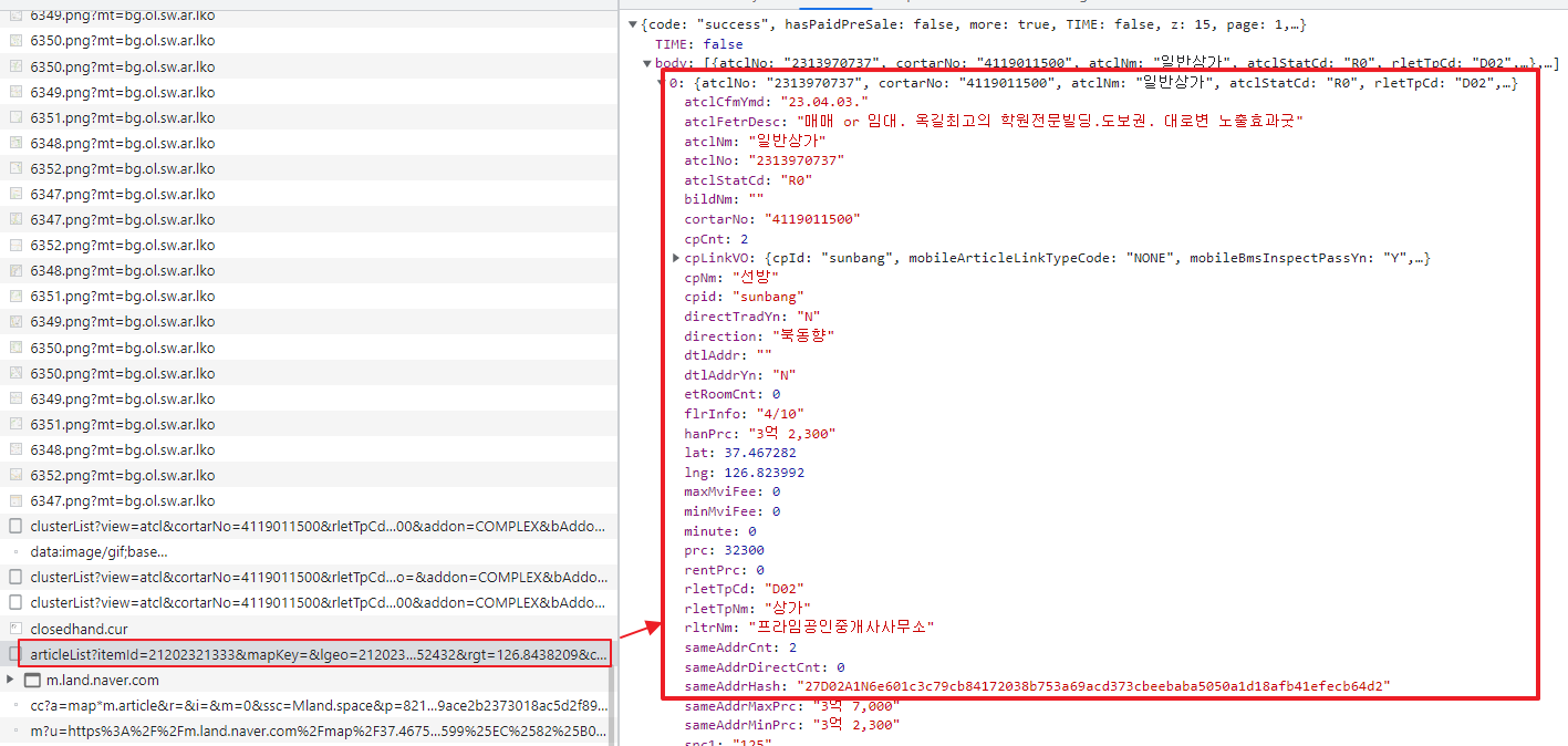 마지막 단계에서 articleList 요청을 통해서 각 매물 별 요청 진행 및 원하는 데이터를 얻을 수 있다.