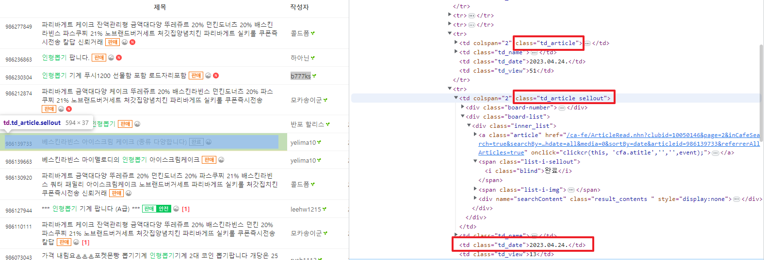 판매중의 경우 td_article, 판매 완료의 경우 td_article sellout으로 구분되어 있었다.