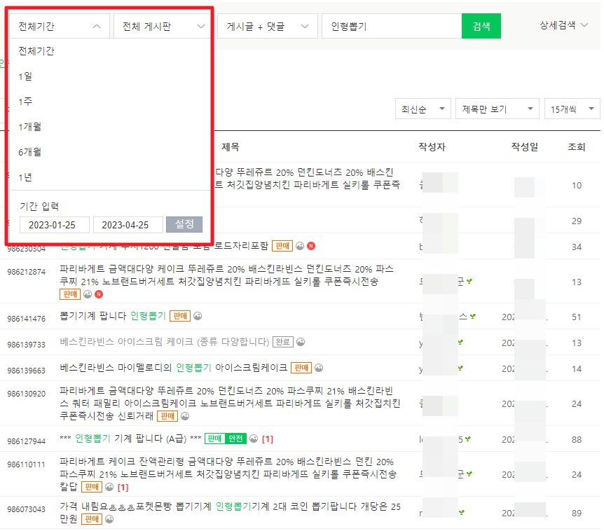 : https://cafe.naver.com/ArticleSearchList.nhn?search.clubid=10050146&search.searchdate= {검색기간} &search.searchBy=0&search.query={검색 명령어}&search.defaultValue=1&search.includeAll=&search.exclude= &search.include=&search.exact=&search.sortBy=date&userDisplay={페이지 당 상품 수} &search.media=0&search.option=0