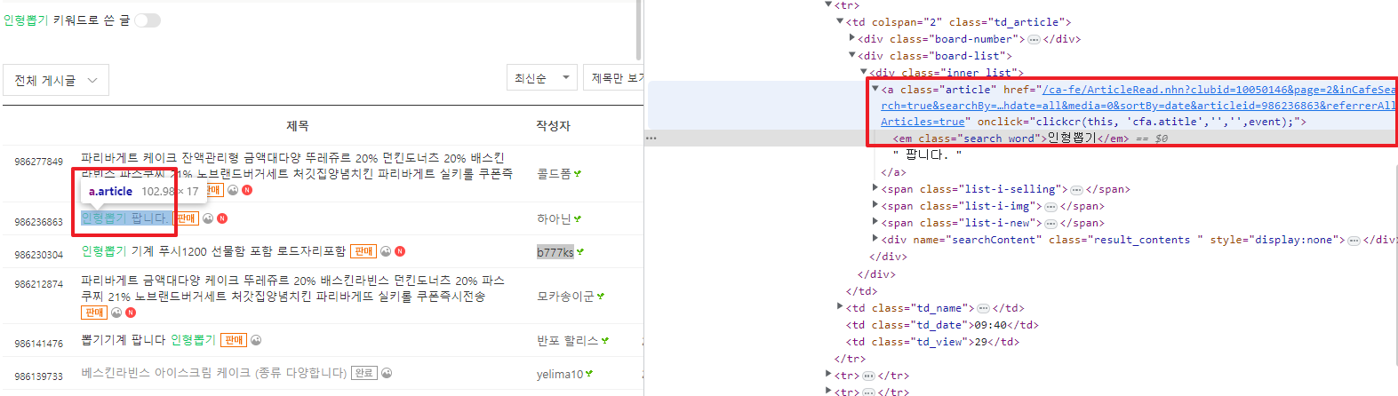 먼저 제목의 경우는 HTML 상 <a> 태그의 -> class 명 : "article" 로 find 하면 찾을 수 있을 것으로 판단이 되었다.