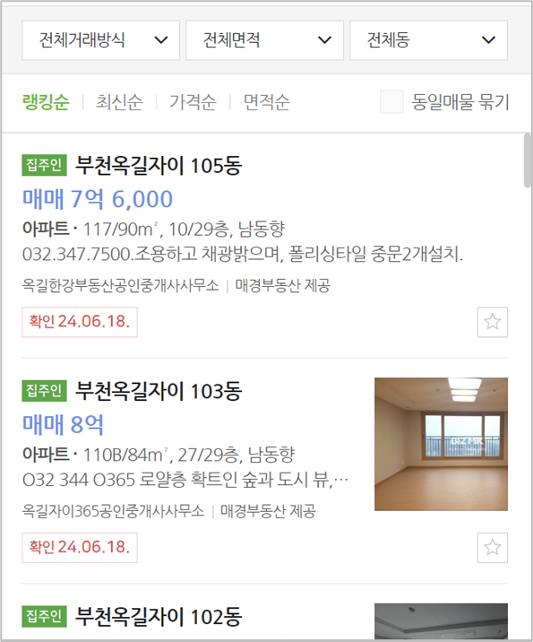 > 샘플로 매물 정보를 추출할 단지로 “부천옥길자이” 첫 번째 단지 코드를 사용하여 매물 정보를 조회합니다.